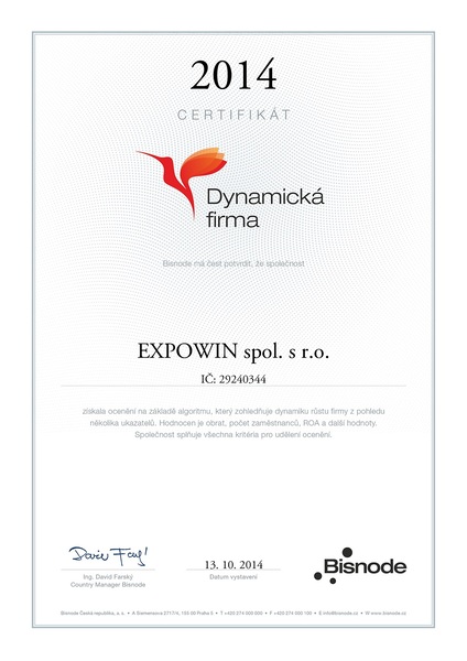 vor allem dank Ihnen und Ihrer Zufriedenheit haben wir die Würdigung „DYNAMISCHE FIRMA“ erhalten. Das bedeutet, dass ExpoWin spol. s r. o. eine vertrauenswürdige, erfolgreiche Firma ist, die zu den elitären Gesellschaften auf unserem Markt gehört.