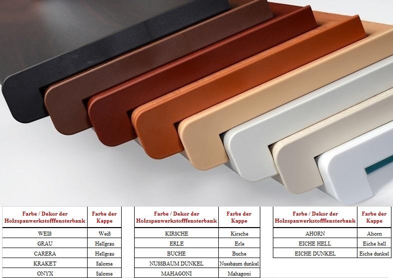 Farbe je nach Fensterbank (Ahorn, Mahagoni, Kirsche usw.) - s. Holzspanwerkstoff-Innenfensterbänke
